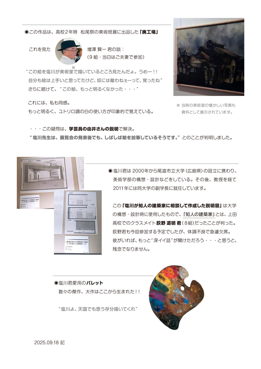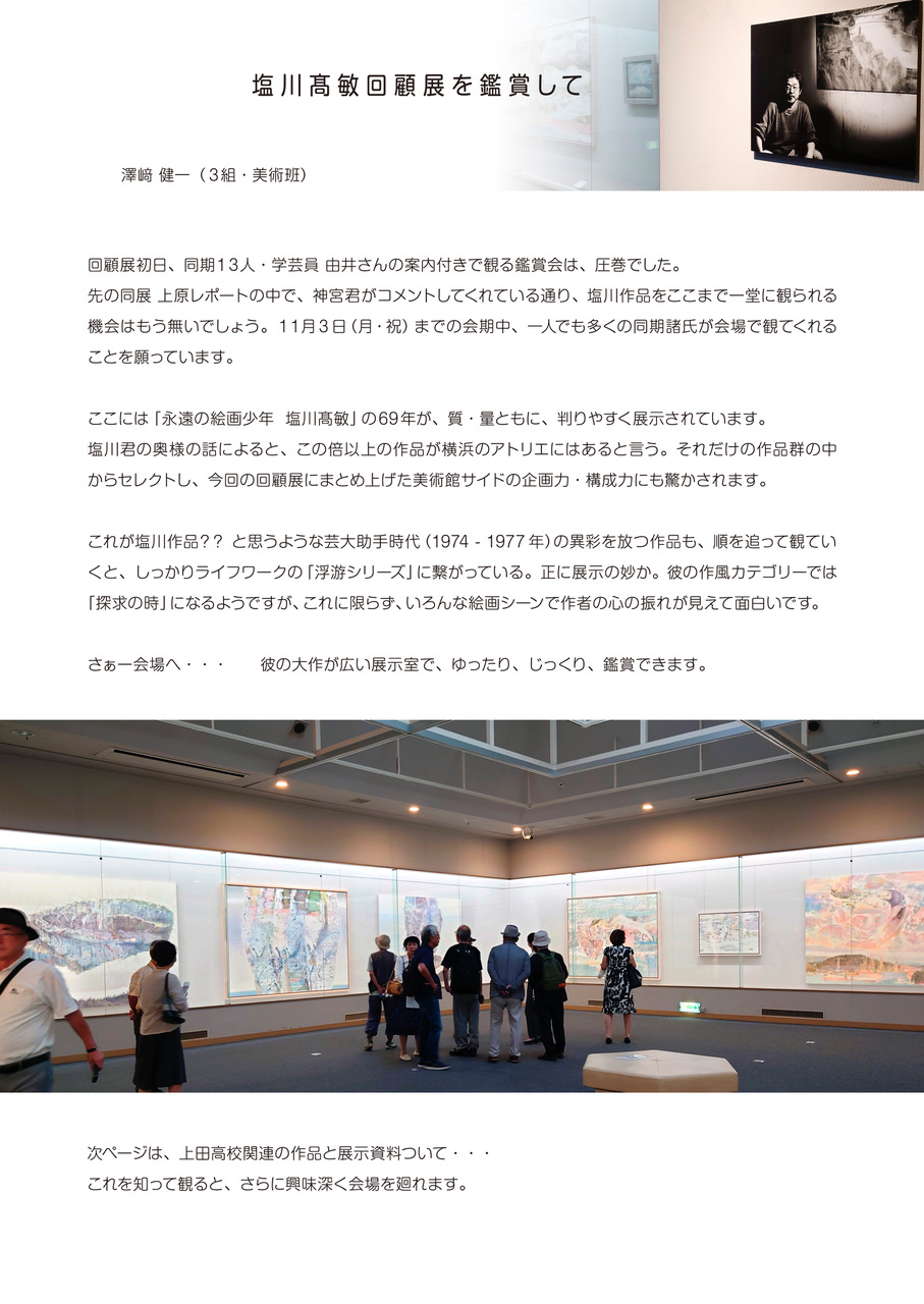 - 【上原リポート196】現在、佐久市立近代美術館にて開催されている塩川髙敏回顧展の初日に同期13人が集まり、鑑賞会が開催されました。上原昇君(2組)が鑑賞会の様子をリポートしてくれました。この故塩川君(8組)回顧展の開催に当たっては澤崎君(3組)を始めとして同期の何人かが協力しています。美術に関心のある同期諸氏には美術館まで足を運ぶことを強くお勧めします。